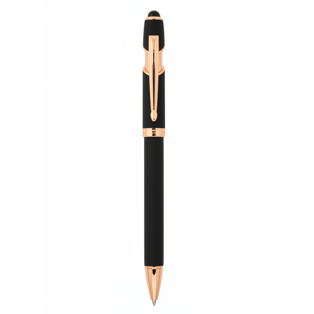 pluma de aluminio ejecutiva, con cuerpo mate de caucho, stylus en parte superior y detalles en rose gold. mecanismo retractil.