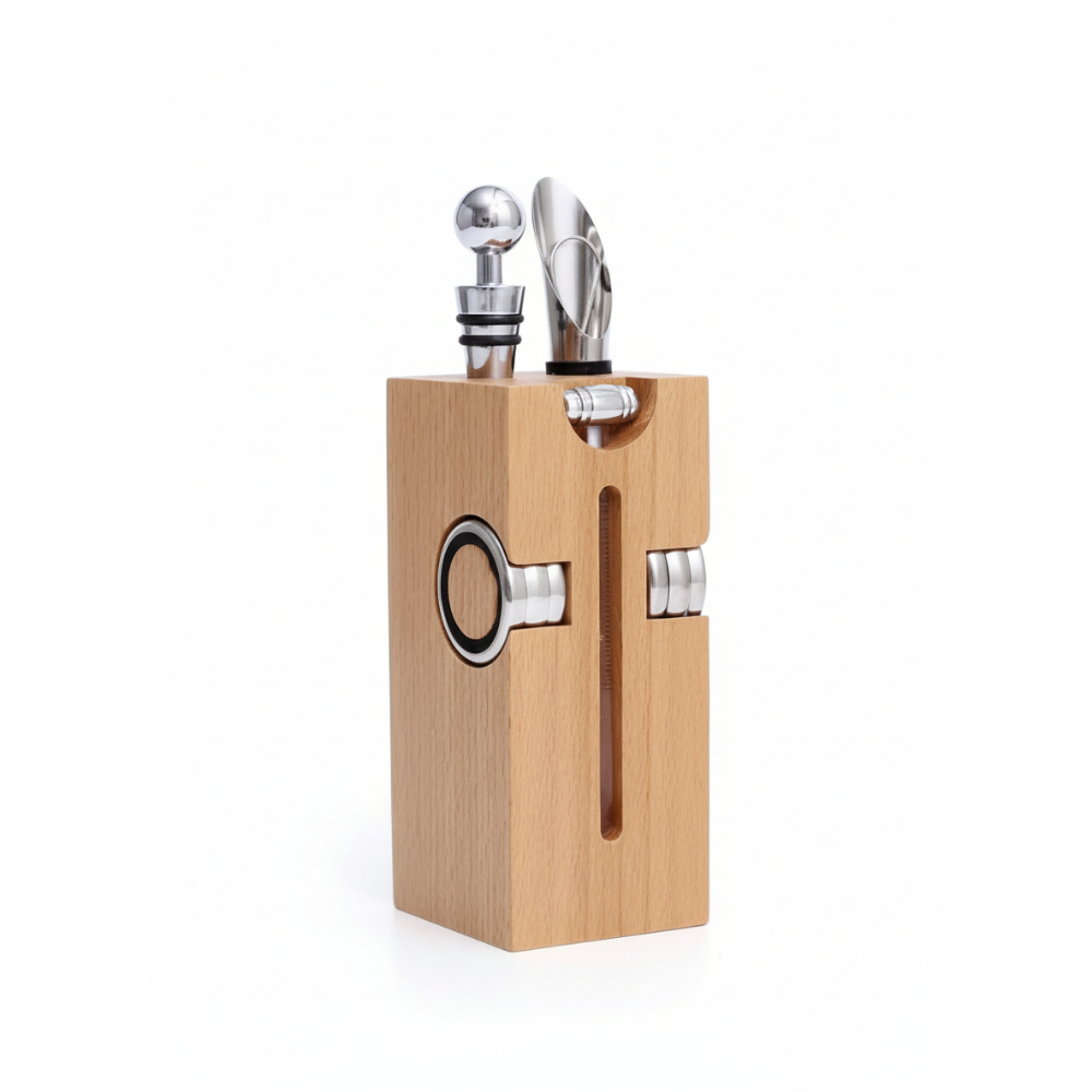 set de accesorios para vino, modelo torre, trae 6 accesorios, en madera natural. 6″ x 2.75″