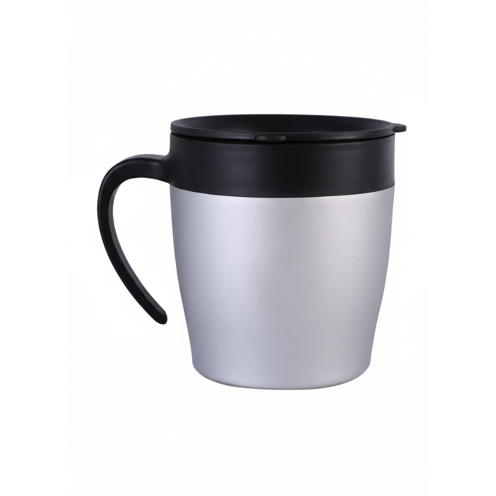 taza de acero metalico mate, agarradero, tapa anti- derrame y cuchara. doble pared. 4″ x 3.5″. 12 oz.