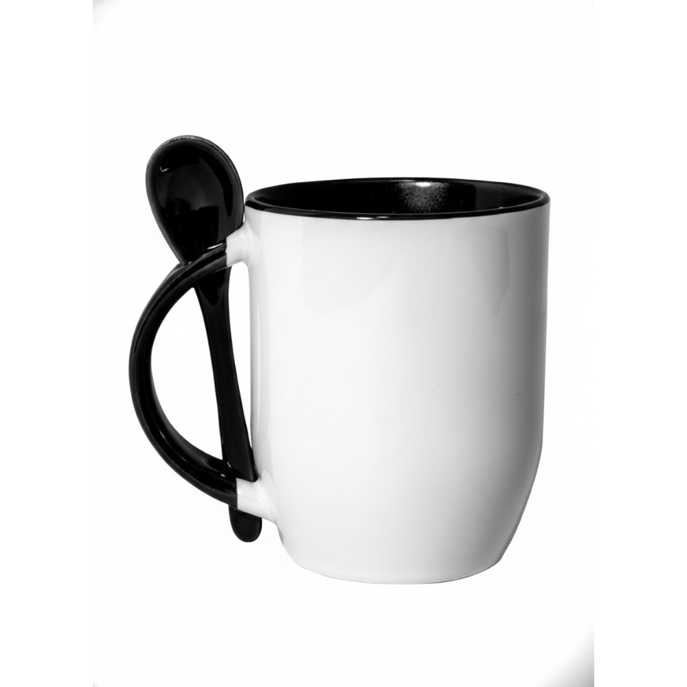 taza de ceramica con cucharita. interior del color de la cuchara, para sublimar. incluye caja. grado aaa. 12 oz. tamaño: 4″ x 3.25″.